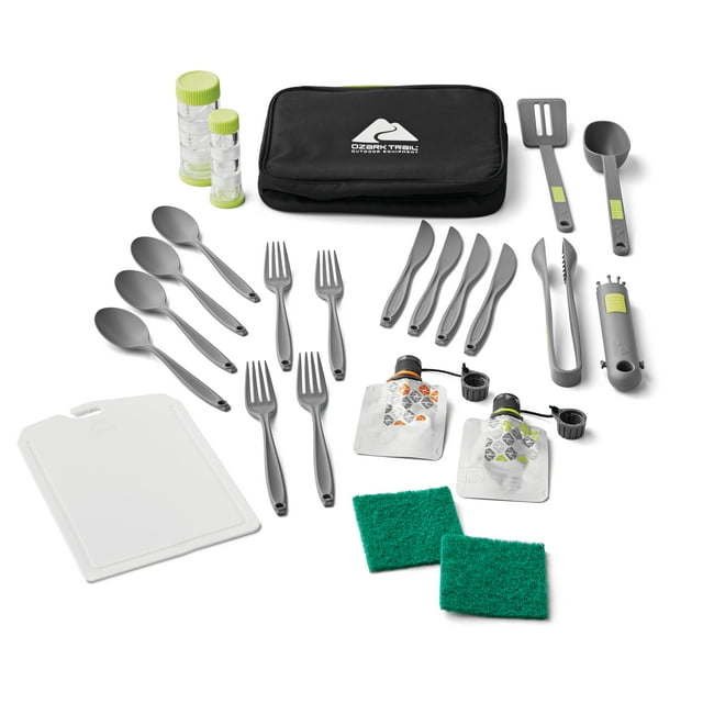 24-Piece Outdoor and Camping Kitchen Cook Set with Travel Bag is the new go to set. Every Destination Kitchen Set includes 4 forks, 4 spoons, 4 knives, a collapsible whisk, serve spoon with measuring components, spatula, tongs, small spice, large spice, 2 condiment pouches, cutting board, 2 scrub pad, and nice carrying tote. The utensils are made from a durable plastic material in the color grey for a clean look the ultimate feast in the forest! All you have to do is cook, clean, and store your kitchen set for the best compact camping experience!