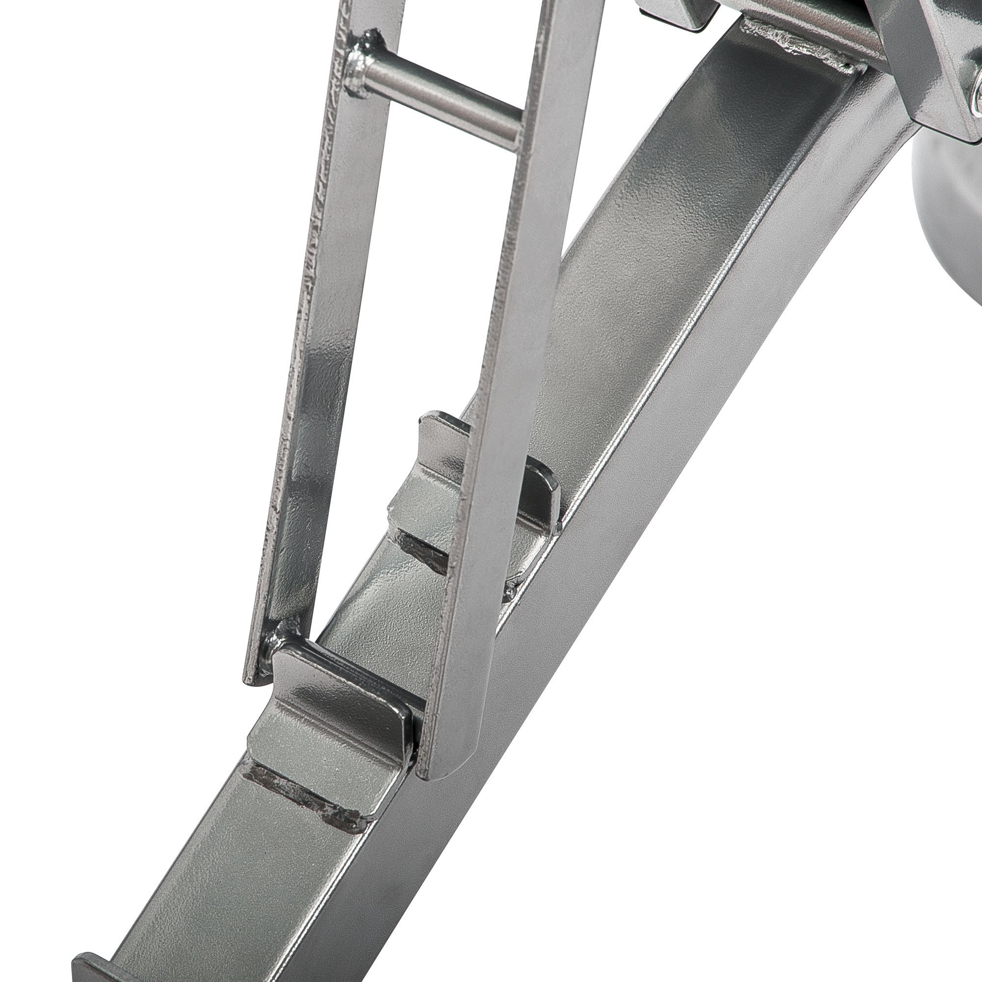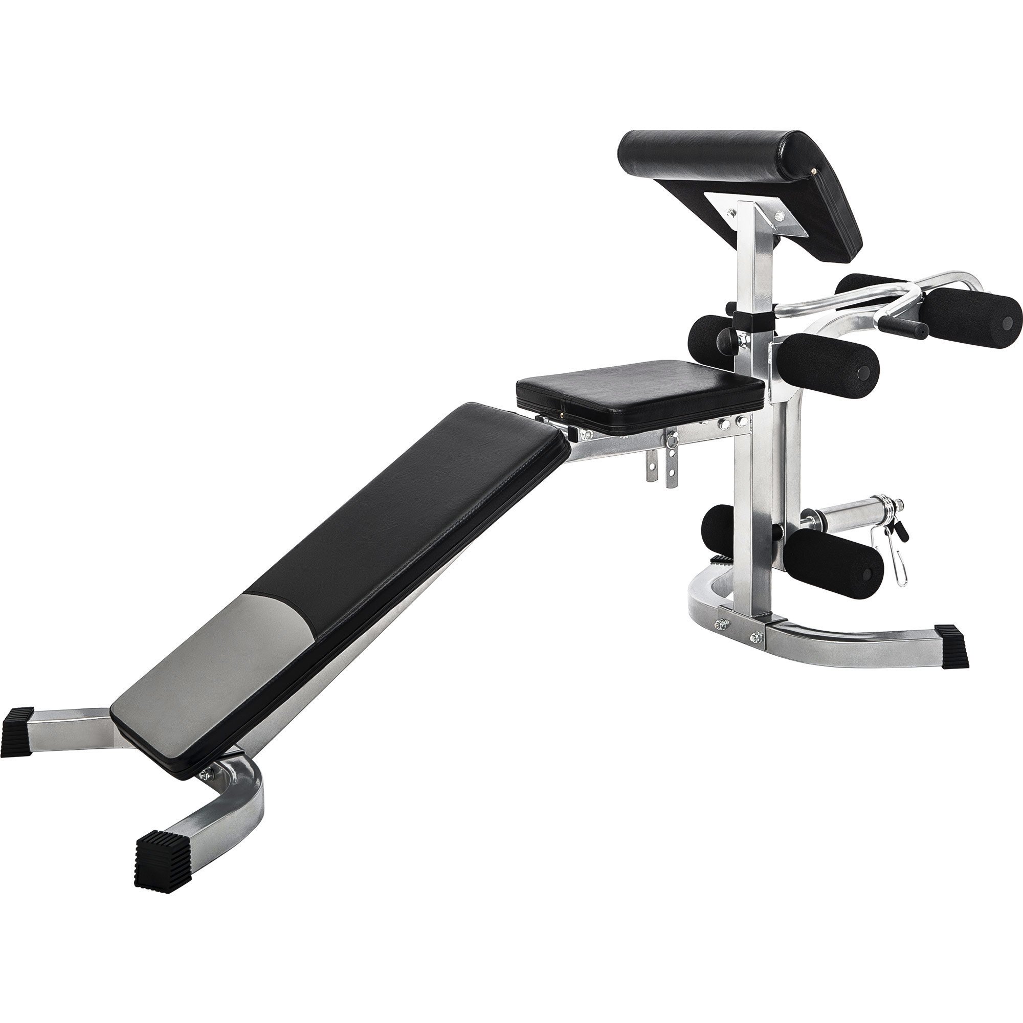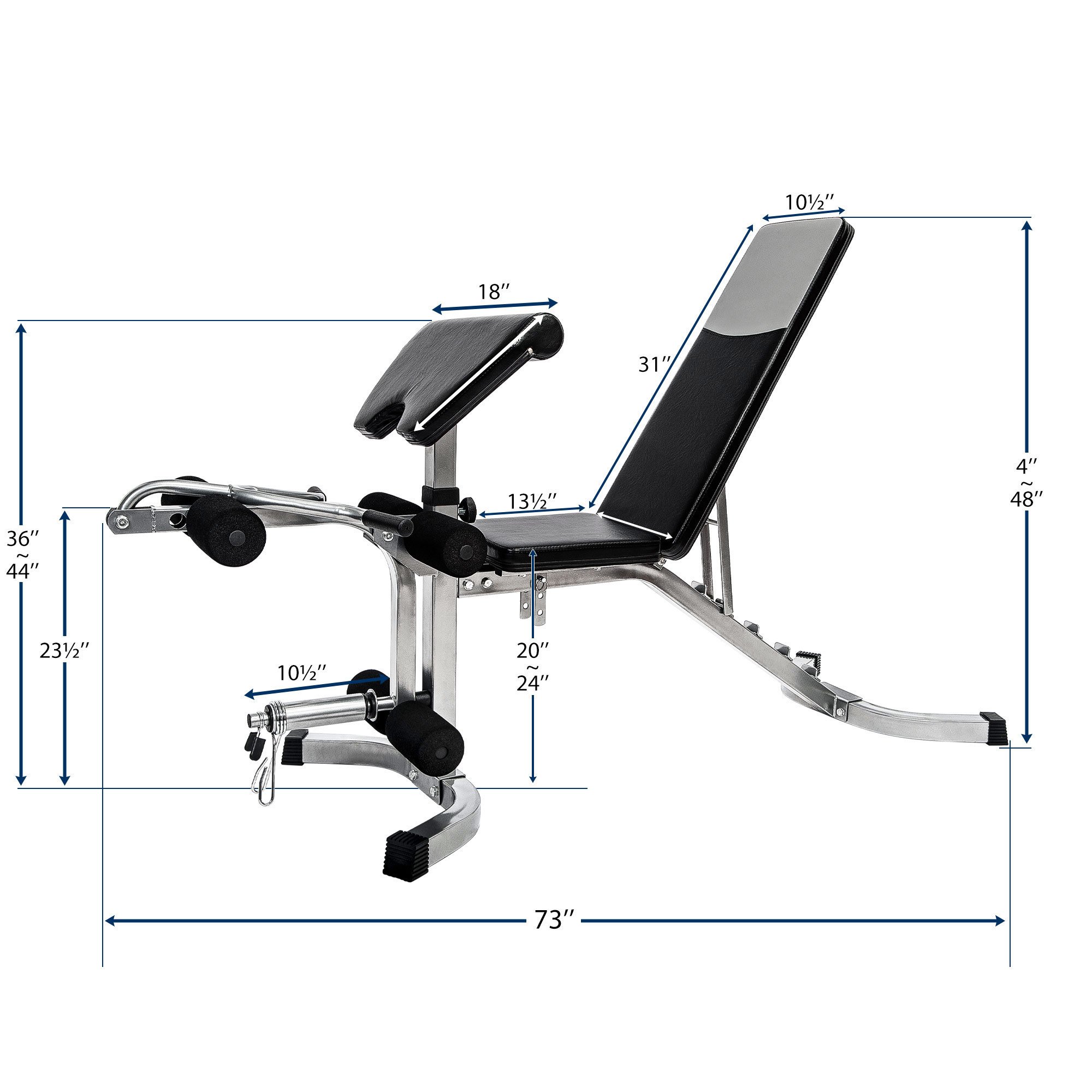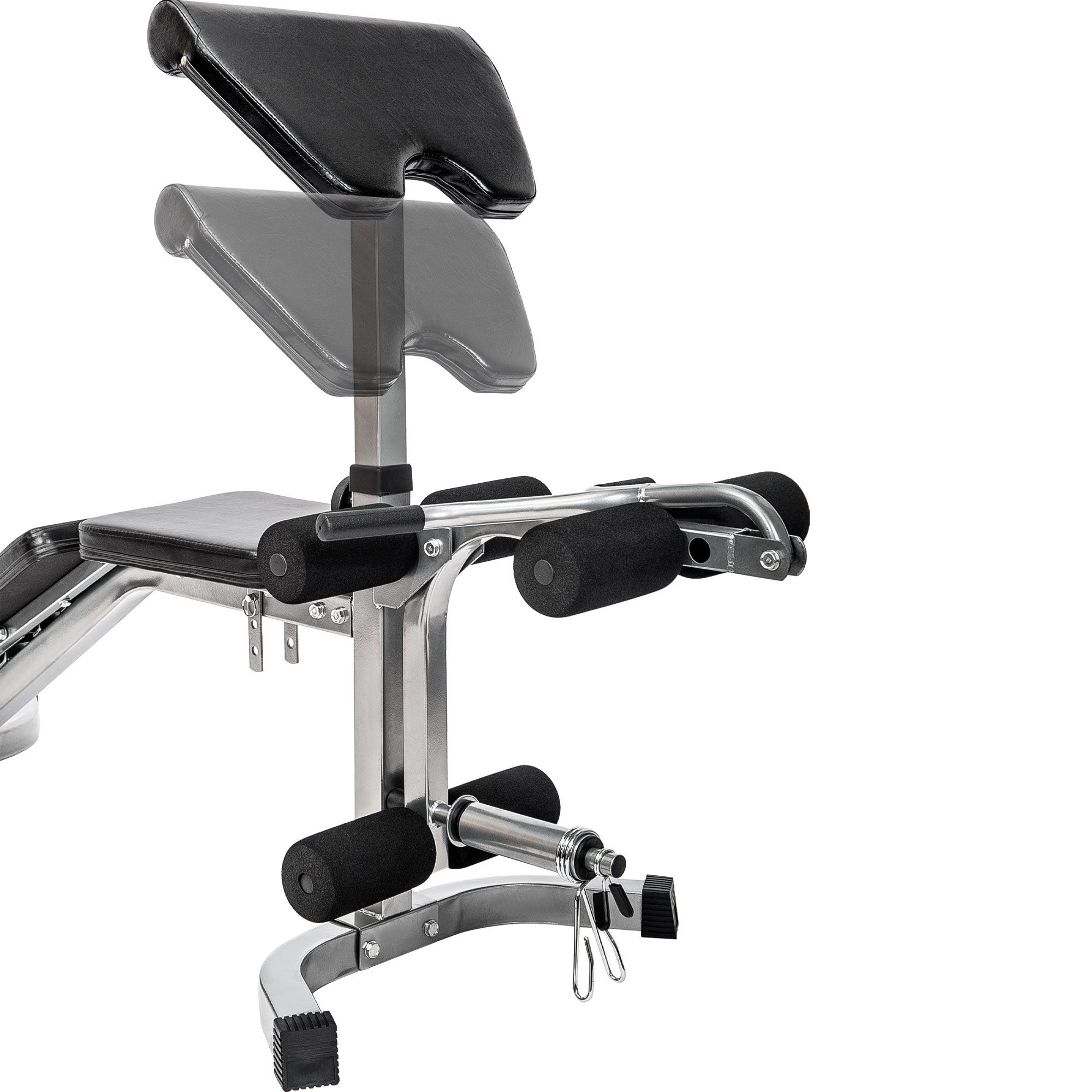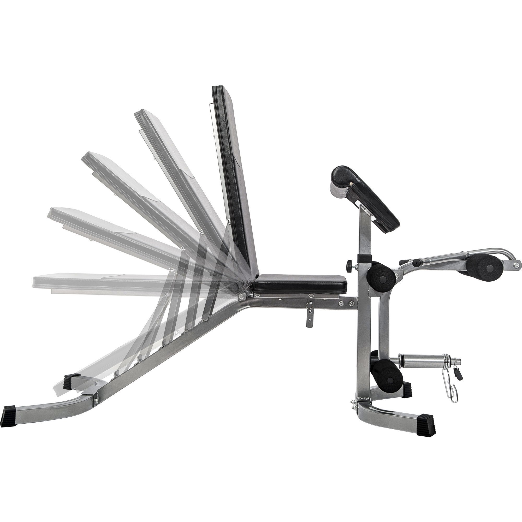 Arched front legs to prevent tipping when adding weight to the front. Bench adjustable in 6 + 3 positions for precise positioning while maintaining maximum stability during weight training. Flat incline weight bench with preacher curl and leg developer to work both upper and lower body.