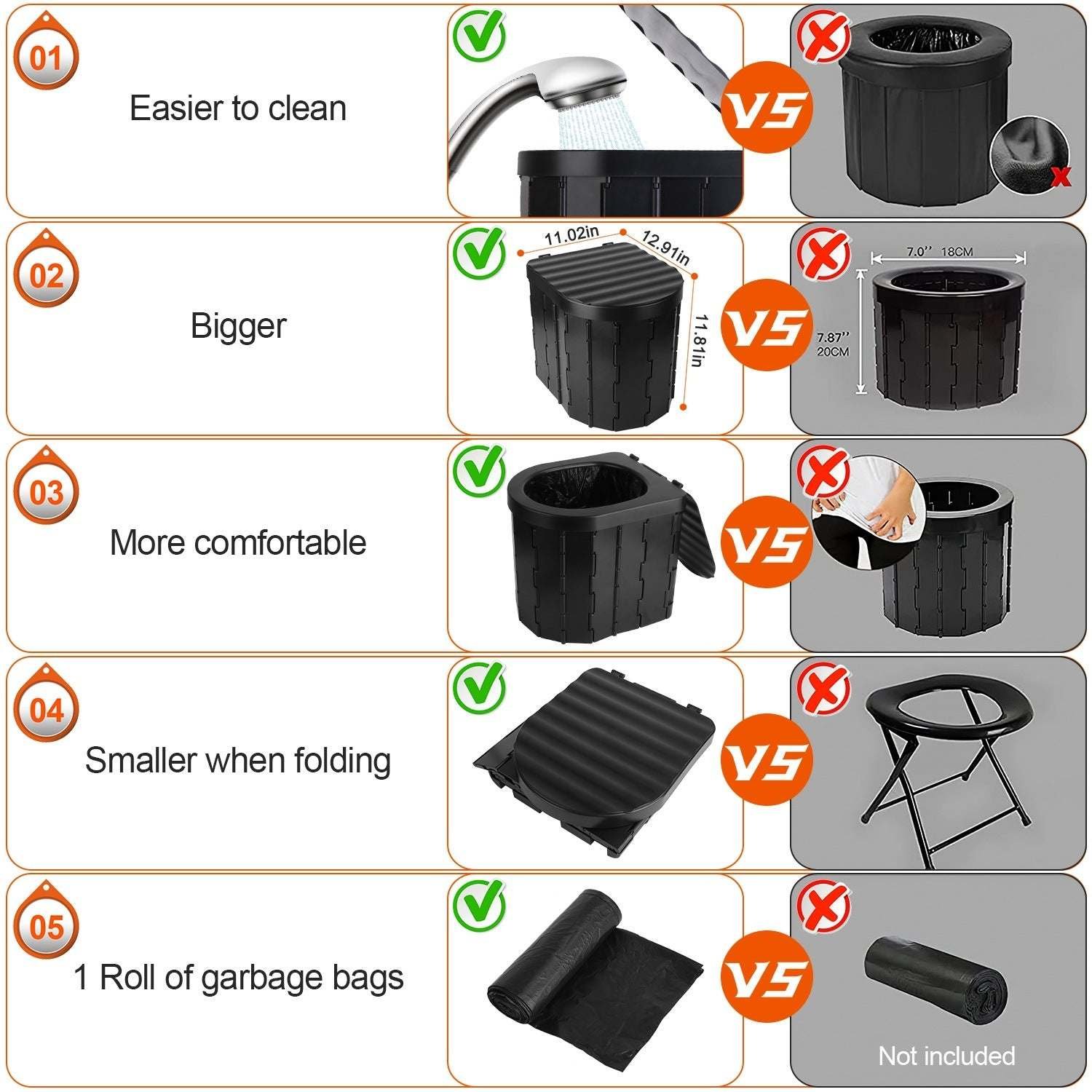*Foldable Travel Toilet*:Our 2.24lbs portable toilet is foldable for convenient storage,which can be folded down into 2.76 in in thickness,space-saving and lightweight that you can easily carry it when you go for outdoor activities like camping,hiking,a road trip,simply saving you from awkward situations or emergencies. It's simple to use,set up and fold down in seconds.