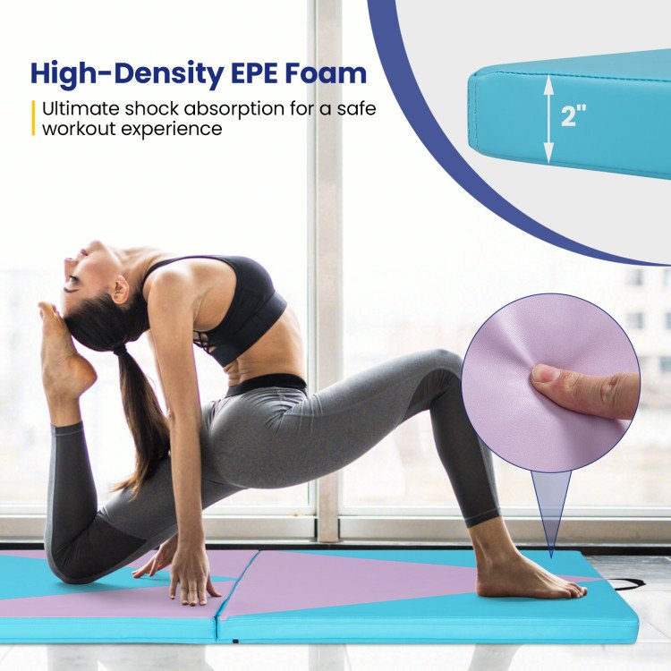 5.Space-Saving Design: This gymnastics mat features a foldable 4-panel design that allows for easy storage and space-saving convenience. Whether you're a professional gymnast, athlete, or fitness enthusiast, this versatile mat is perfect for various exercises, stretches, and routines.
