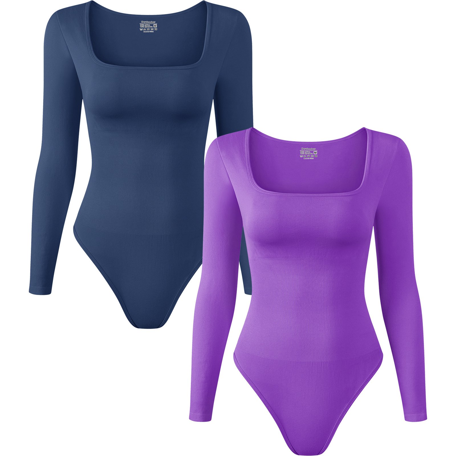 2 Pcs Long Sleeve Bodysuit Jumpsuit for Women, Seamless Ribbed Square Neck Shapewear for Women
