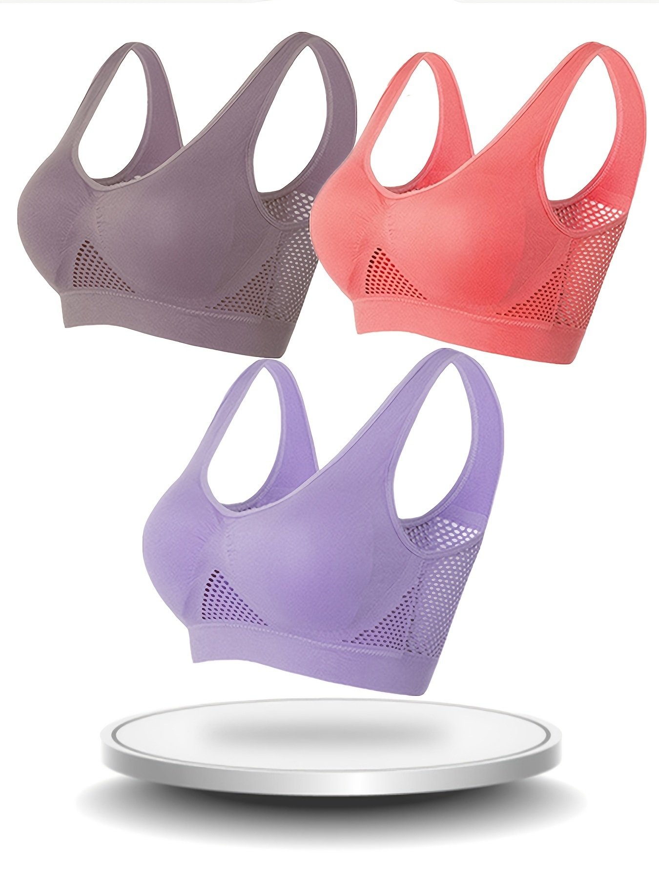3 Pcs Breathable Solid Eyelet Mesh Hole Vest Sports Bras, Plus Size Non-steel Running Yoga Bras, Women's Lingerie & Underwear
