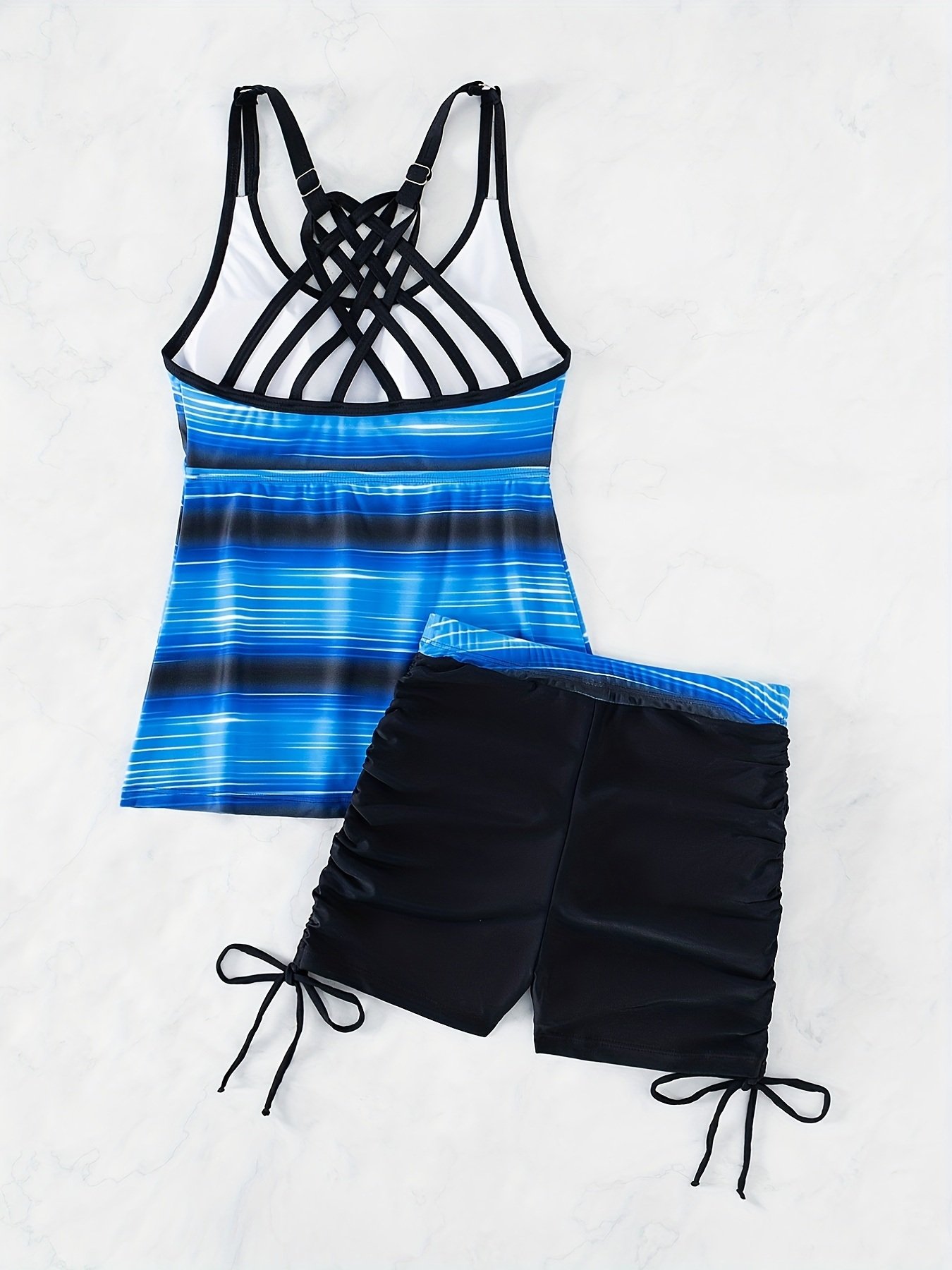 Striped Print Round Neck Tankini Sets, Criss Cross Strap Drawstring Boxer Short Bottom Two Pieces Swimsuit, Women's Swimwear & Clothing