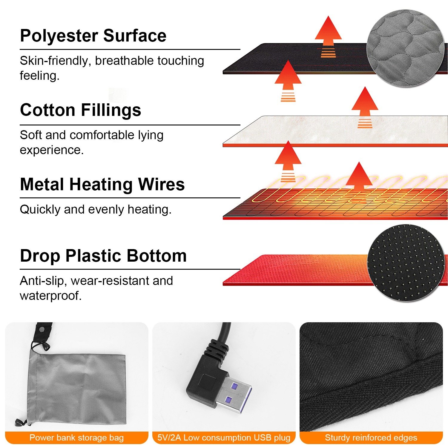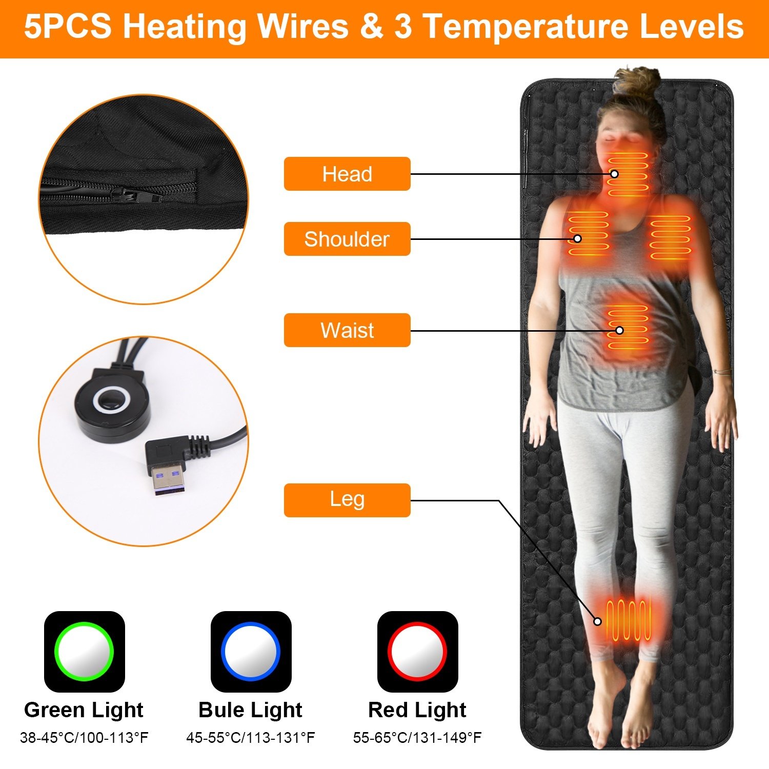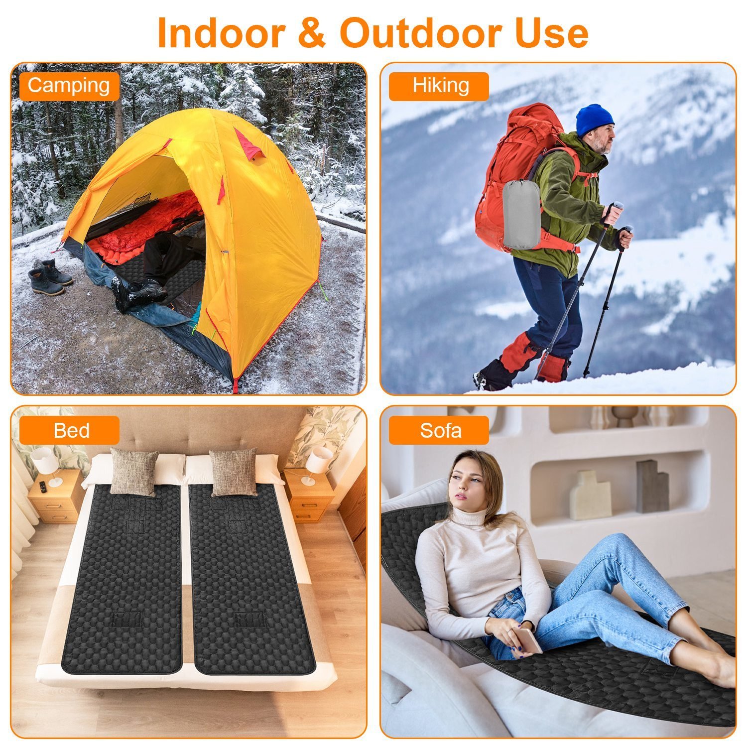 *Large Size Heating Pad*:Featured with 5pcs heating wires with large heating areas,our 76.77x24.01in large size heating pad fits for most figures of man and woman. After connected to power bank(not included),this sleeping bag pad achieve quickly and evenly heating up and keep your back,hip,leg,feet constantly warm in outdoor chilling winter.